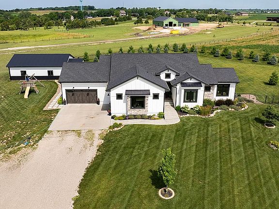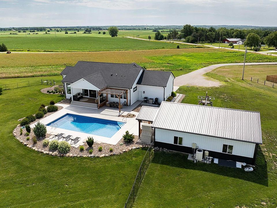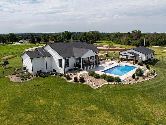Situated on a serene 3-acre lot just 5 minutes west of Polk City, this exquisite property combines modern luxury with tranquility. Custom built in 2019, this estate sits well off the road, providing a quiet retreat accessible via a paved road. The meticulously landscaped grounds feature newly planted trees, stamped concrete paths, and a 40x32 shed built in 2020 for ample storage and activities. The fenced yard ensures a safe environment for loved ones to roam freely. The centerpiece of the outdoor space is the 20x40 saltwater inground pool, complete with heating, cooling, and an auto cover. Surrounding the pool, professionally coated concrete, beautiful landscaping, surround sound speakers, and WiFi-controlled lights create a luxurious outdoor space for relaxing and entertaining. Designed by Innov8 Homes, this expansive residence boasts 4,419 sq ft of living space, with 2,185 sq ft on the main level and 2,234 sq ft in the basement (1,550 finished). Step inside to be greeted by 10-ft ceilings that enhance the open, airy ambiance of the main floor. The sophisticated living area seamlessly flows into the gourmet kitchen, featuring a hidden butler's pantry, custom kitchen hood vent, and gleaming quartz countertops. Luxury vinyl flooring, both pet scratch-proof and stunning, spans the main level. The home offers 5 spacious bedrooms—3 on the main level and 2 in the finished lower level—alongside 4 elegantly appointed bathrooms. The basement also includes a large wet bar and entertainment area, wired for surround sound, and a safe room under the front stoop for added peace of mind. The estate is wired for a comprehensive security system, with cameras included and ready for your setup. Enjoy modern conveniences such as WiFi-controlled external lights and a WiFi sauna by HUUM. The pool is 7 ft deep and the chemical levels are meticulously maintained by Swimming Pool Supply in Grimes. This home offers a 3-stall garage (including an oversized third stall), a reliable septic system with annual maintenance. The Woodward-Granger School District, with a new middle school slated to open in August 2026, adds to the appeal for many.