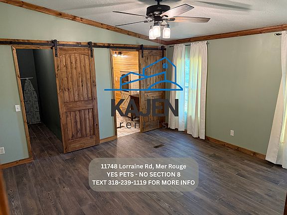 Please read the following information prior to contacting us as this should answer most questions. -No Section 8. -Some Pets OK with $200 Non Refundable Pet Fee and pet rent. All pets must be approved. -No rent to own. -No smoking inside. -Rent is $1300.00 -Deposit is $700.00 -Income will be verified on each tenant. -Central Heat and AC. -Located at 11748 Lorraine Rd Mer Rouge. -We provide refrigerator, stove, and dishwasher. -3 bedroom 2 bath home. -You pay utilities (water, electric) -We provide trash service. 50 background check per adult --Bi-monthly HVAC air filter delivery included. --Enjoy country living - 5+ acres with a private dock on Horseshoe Lake. Home has hardwood floors, master on suite bath with walk in closet, appliances, a large storage building, 2 car garage, pecan trees, and a barn. )