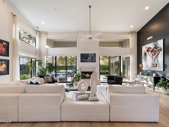 Quintessential mid-Scottsdale one level golf course home. Elevated design-studs out remodel brought to modern life with highest quality materials & fittings. Grand floor plan+scale delight. Lofty ceilings, warm light oak hardwoods. Expansive,masterful kitchen in pleasing,black,cream & touches of gold. Double ovens, custom hood, designer tile+extra-large entertainment ready island. Bringing the outdoors in, a fully opening window in the kitchen reveals a bar, What Fun! Great room with all the spaces you could want to entertain in. Grand fireplace,bar,dining area & spacious kick your shoes off living room. Spectacular owners retreat w/ it's elegant bath. Down the hall: Lrg bedroom+remodeled bath+3rd bedroom/office. Resort-like backyard complete w/ a pool. Gated community. Live life well!