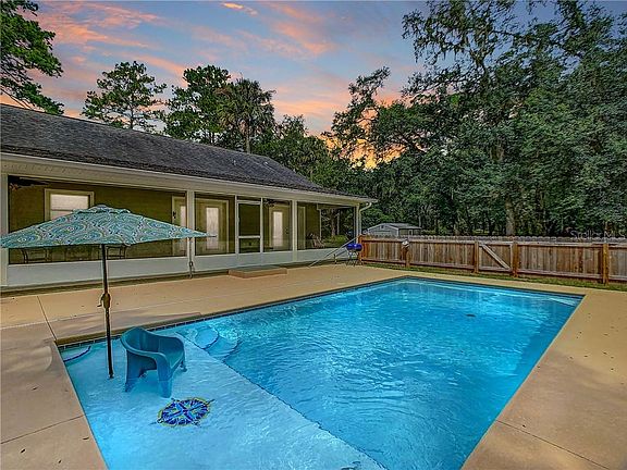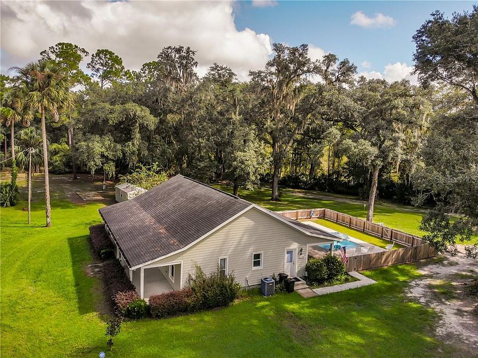 Country living at its best! 3 bedroom, 2 bath pool home on 5.77 acres, The home welcomes you with a long covered porch, perfect for your rocking chairs and morning coffee. A split open floor plan, living and dining area has french doors that open to the rear screened in lanai overlooking the fenced in pool and entertaining area. The kitchen offers a walk in pantry and bar for casual dining. Master bedroom with ensuite bathroom,large walk in shower, garden tub, double vanities, french doors open to the lanai off the master bedroom. Inside laundry and 2 additional bedrooms with guest bathroom.The exterior has a set up for an additional space for an inlaw building/home. Impact fees have been paid. A storage shed conveys with the property. Newer drain field, A/C had all new components last year.