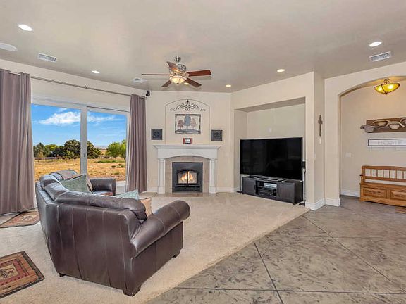 High end custom home on 4.08 acres located in a neighborhood of site built homes and incredible views. Split 4 bedroom 3 bath plus office, 10'+ ceilings. Custom touches throughout starting with barreled ceilings in foyer and coffered in dining and living areas.Formal dining area framed in elegant pillars,breakfast nook with mountain views and Andersen doors and windows throughout. Stamped concrete and carpeted floors. Cherry cabinets with an island in the kitchen and wet bar. GE Monogram appliances with convection double ovens and gas stove top with griddle. Granite custom edged countertops, matching granite showers surrounds master bath has dual shower heads body sprayer, hand helds, & a rain heads with a separate large Jacuzzi tub for two. Separate additional washer/dryer in large master