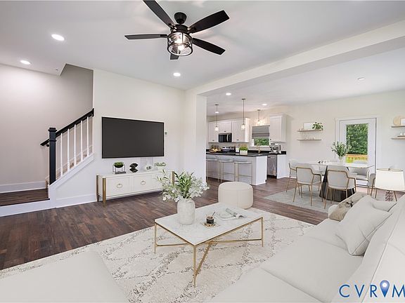 At the heart of the home, the designer kitchen features stainless steel appliances, sleek gold fixtures, and an open layout that flows naturally into the living and dining areas. A mudroom/laundry room and a half bath add everyday convenience just off the main living space.