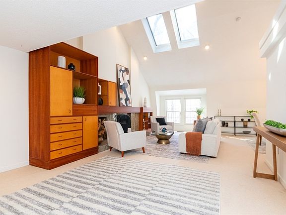 Dramatic townhouse in original carriage house in Chestnut Grove condominiums. Private and serene setting with views of nature. Light-filled and spacious with high ceilings. Flexible, open floor plan allows many possibilities for various lifestyles. 2 bedrooms, 2 baths, plus den/3rd bedroom and loft. Living room features handsome custom cabinetry, wood-burning fireplace, vaulted ceiling and skylights. Eat-in kitchen offers plentiful storage, generous counter space and washer & dryer. Airy loft overlooking living area has many possibilities and great storage. Lower level with bonus room suitable for exercise or storage and 2-car tandem garage. Close to major highways, shopping and restaurants.