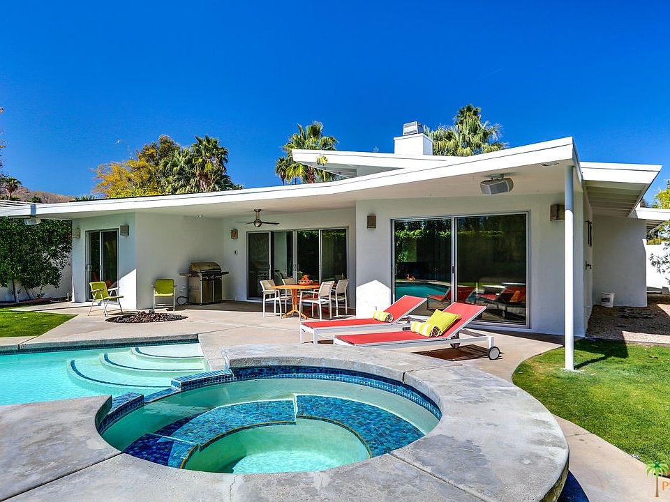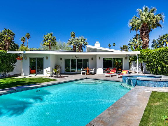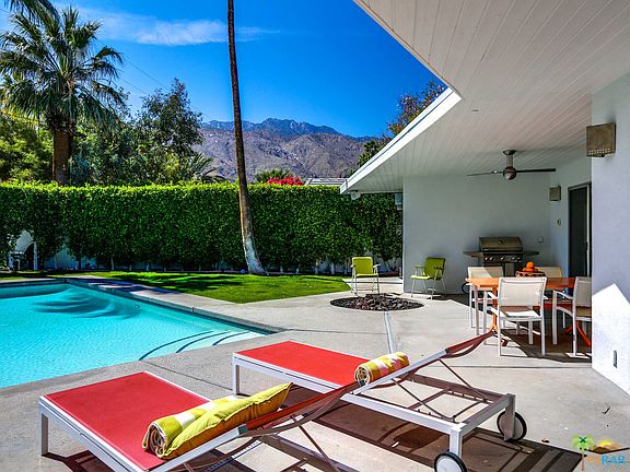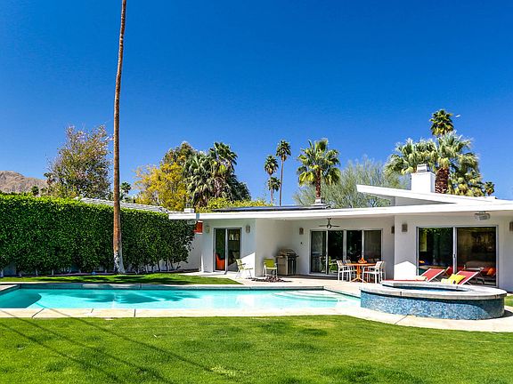 This charming and contemporary home originally built in 1950 is located in the great Ruth Hardy Park / Movie Colony East neighborhood, and it features 3 bedrooms and 3 full bathrooms, large family room with modern kitchen, dining room, 3 gas fireplaces, and a beautiful private backyard with a large sparkling pool, hot tub, and fire pit with lovely mountain views. This cool home also has a 5.886 KW Hot Purple Energy solar panel system that offers substantial savings on energy costs. Conveniently located in Central Palm Springs and a short distance to the Uptown Design District and Downtown Palm Springs. Fee land - no land lease.