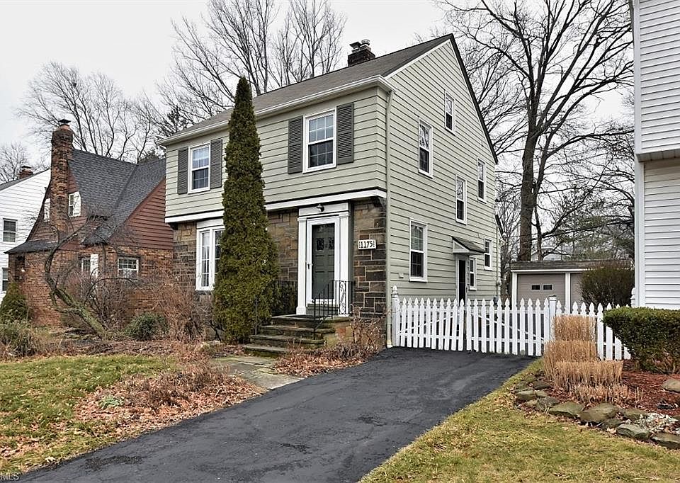 Cute, stone accented colonial with updated eat-in kitchen with stainless appliances, granite counters and custom tile back splash and cork floors! Sunny living room and dining room with hardwood floors. Classic fireplace and mantel in living room. Dining room leads out to a 3 season porch. Second floor has 3 bedrooms and a hall bath with tub and shower combo. Good condition hardwood floors under carpet on 2nd. Walk up Attic with lots of space for storage. Nicely finished family room next to laundry room in basement. Furnace 2017, Hot Water Tank 2018. Newer windows throughout home. New rubber (EPDM) roof on garage (2020) Exterior painted in 2019. All appliances stay! Fully fenced in backyard with pretty perennials and deck with seating off of 3 season porch. Two car garage with opener. Very convenient location - only 15 minutes or less to Cleveland Clinic or University Circle. Why rent when you can buy for less than $800 a month. Owners may consider lease purchase (renting during delayed closing).