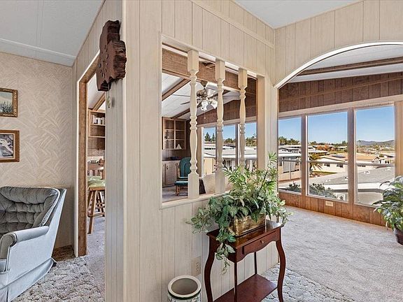 View property located in a 55+ land owned community! Beautiful panoramic mountain & city light views go forever! This is a Post HUD home, so the year built qualifies for VA & conventional / Fannie Mae financing! Formal entry that leads to a Living room w/ vaulted ceilings and separate Family room. Lots of built in storage including a wet bar, entertainment center, dining hutch, and more! The Kitchen has pull out drawers in the pantry & a high dining bar. Double sinks in the Primary Bathroom. Light walls throughout most of home. Deep sink in utility room. There is a large workshop / shed and a low maintenance yard. Low HOA fees of only $238 per month include water, trash, and sewer!