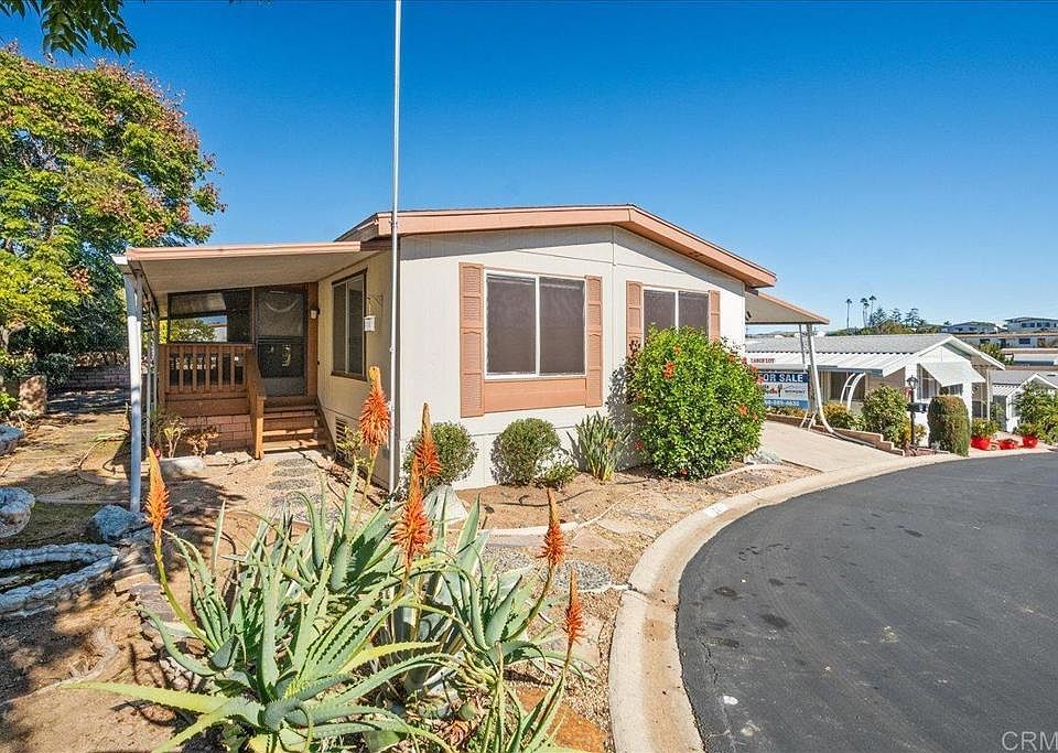The value of this property is the Big lot with tons of privacy, Fruit trees and a great yard. You don't usually get this in a manufactured property where you own your own land! The backyard is huge and extends out where there is a beautiful producing avocado tree. This property is located in the desirable La Moree Estates. There is no space rent here. Your small HOA fee covers your trash, water and basic cable. Your only other bill besides your HOA fee is your SDG&E. There is also RV parking for a very small fee available. Death on property August 6, 2023. Died peacefully in his sleep. Roof Recently replaced within last 10 years, newer windows to block sun installed recently to block sun and keep the heat out. New Roof installed 2014 New Gas furnace installed 2014.