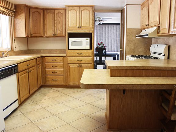 VIEW property in 55+ land owned community! Nice sized EZ care yard. Breezy covered porch. Widened driveway. Interior offers an updated Kitchen, dual pane windows, over sized laundry room with deep sink & built ins, separate Living room & Family room, gas fireplace, and more! Master offers dual sinks, tub, & step in shower! Cul-de-sac location. Beautiful 55+ community with pool, spa, BBQ area, clubhouse, fitness room, billiards, library, activities and so much more! LOW monthly HOA fee of $210 includes water, trash, sewer, and basic cable!