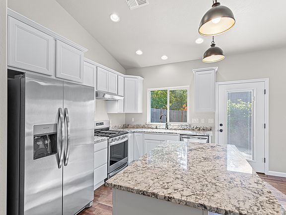 Newer single-level home in a desirable cul-de-sac located near parks, schools, shopping, and restaurants of NE Grants Pass! Vaulted open-concept living with engineered wood floors, kitchen with granite counters and dining island, soft-close drawers and doors, stainless appliances including new Whirlpool five-burner gas range oven with griddle and Frigidaire refrigerator, primary bedroom with sliding glass door to private covered back porch, full ensuite bathroom with granite double vanity, oversized shower, walk-in closet with built-ins, guest bedroom with closet, full guest bath with tub shower, and a spacious two-car garage. Fully fenced backyard with cascading water feature, terraced gardening areas, poured concrete patio, storage shed, and expansive view deck. Property backs to a 0.38-acre common area with grass lawn, mature trees, and covered gathering area. Association dues of $150 per month cover all water plus common area maintenance and electricity. Inquire for details!