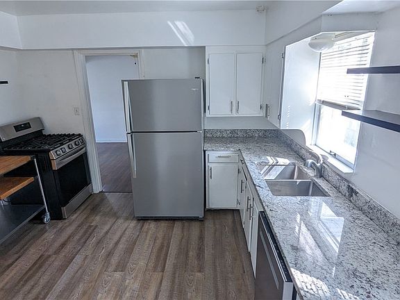 Welcome to this stunning colonial home with a spacious 1400 ft² layout and beautiful original hardwood floors throughout. As you enter, you'll be greeted by a cozy living room featuring a picture window and a fireplace with a marble accent and a white trim mantle. Adjacent to the living room is a formal dining room, and just off of it, you'll find a sunroom where you can indulge your green thumb. The kitchen is a chef's dream, boasting new stainless steel appliances, including a stove with a built-in air fryer feature. The kitchen also features brand new vinyl flooring and elegant granite countertops. On the main floor, there is a convenient half bath.