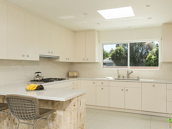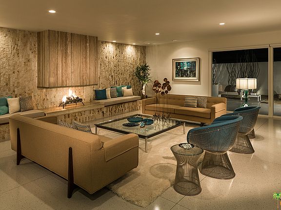 A True Period Restoration as seen in Palm Springs Style, August 2016 and The 2017 Palm Springs Modernism Tour. The vision of a Platner lounge chair, originally designed in 1966, ultimately guided the re-design of this 1961 Deepwell corner lot home, thought to be attributed to Hal Levitt. The Designer - Homeowner, taking a purist approach, procured rare period-specific 2 X 2 porcelain tile for the kitchen and bathrooms while the original carved front doors were retained and the hardware restored and re-chromed. To compliment the home's original travertine bar and fireplace, new concrete terrazzo flooring was poured throughout the home and onto the covered patio. No expense was spared in this labor of love inside and out. Notably, the home is not a time capsule or shrine to the period but a testament to the staying power of 1960's design and its relevance to both the Palm Springs aesthetic and lifestyle. Furniture package available outside of escrow. Photography by Lance Gerber.