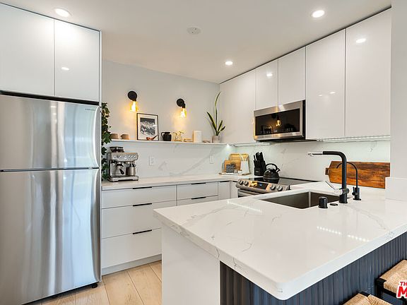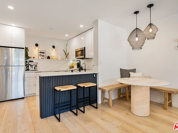 Set in one of Brentwood's most coveted neighborhoods, this top-floor condo has been beautifully remodeled for turnkey modern living. Offering 1 bedroom, 1 bathroom, and a spacious balcony, the residence was fully updated in August 2023. Inside, blonde hardwood floors, recessed lighting, and a refreshed bathroom with new tub, shower, and vanity create a polished look. The kitchen impresses with custom cabinetry, stone countertops and backsplash, and premium appliances, including a stove with air fryer setting. The expansive, turfed balcony extends the living space for outdoor dining or lounging while enjoying views of the Getty Museum. Community amenities include a heated pool and sun deck, sauna, renovated gym, secured entry, guest parking, rooftop patio with panoramic views, and convenient shared laundry. Just moments from the Brentwood Farmers Market, neighborhood cafs, and boutique shopping, this home combines modern comfort with an unbeatable location.