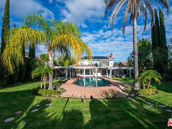 Private, gated estate at the end of a cul-de-sac on nearly half an acre of flat, usable grounds. A long private driveway leads to this impressive Porter Ranch residence featuring a spacious, open layout with soaring ceilings, recessed lighting, and multiple entertaining spaces. The chef's kitchen offers granite countertops, modern cabinetry, and Viking stainless steel appliances, opening to a large family room with a wet bar and fireplace. The dramatic spiral staircase leads to a spacious primary suite featuring a large private balcony and breathtaking views of the backyard. The resort-style backyard is designed for entertaining, featuring a beautiful pool, expansive lawn areas, a covered outdoor lounge with lighting and ceiling fans, a wooden deck, and lush, mature landscaping. Additional highlights include a three-car attached garage and extensive parking possible for RVs, boats, and multiple vehicles. A rare opportunity to own a private compound in one of Porter Ranch's most desirable pockets. New roof and new solar contract.