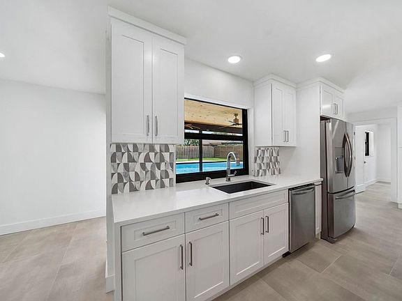 Large pets welcome. Gorgeous fully renovated, unfurnished, 4 Bedroom, 2 Bath, Pool Home w/ 2 Car Garage. Nov 1 move In. Located Garden Woods with no HOA. The renovated kitchen has a huge island that seats up to 7 and opens to the living room & dining room. The kitchen is complete w/soft close wood cabinets, stainless steel appliances & quartz countertops. The whole house has complete impact windows & sliders, 24'' x 48'' large format porcelain tile and recessed lighting. Both bathrooms have been fully renovated and the 2nd bath is also a cabana bath. The screened, covered patio opens to the pool deck and spacious fully fenced back yard. Lawn and pool maintenance included in rent.
