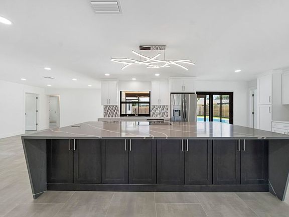 Pool homeHuge islandRenovated kitchenPool deckQuartz countertopsLarge format porcelain tileImpact windows