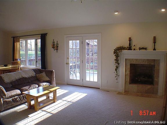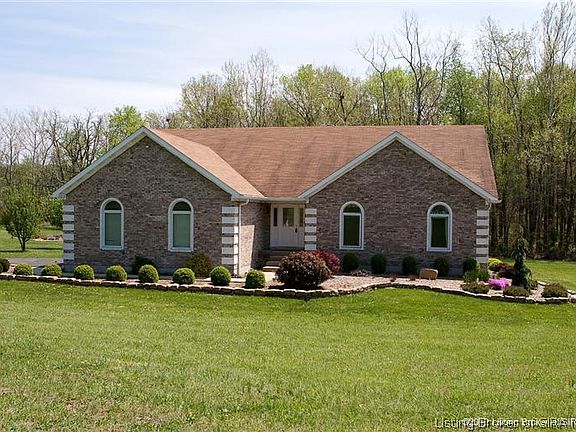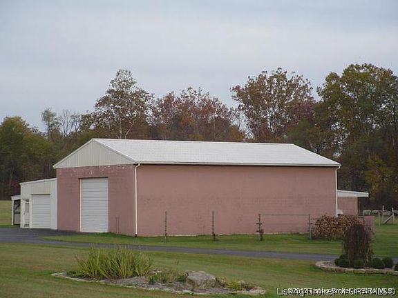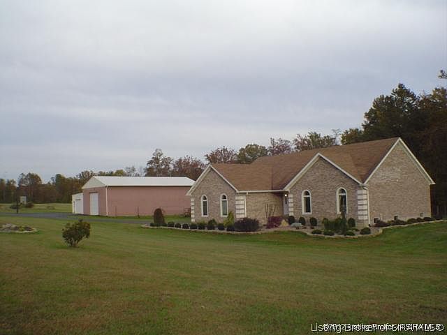 7.62 acres with nice road frontage. Possible trade for home or ground with at least 8 acres, preferably Floyd or Clark County, but would consider other areas. Large custom built brick ranch with full basement and ample 24x26 attached garage, plus large detached outbuilding (the main body is concrete block) with lean-to, workshop, loft, and steel beams. Master bedroom has a walk-in closet and master bath tub for 2, plus separate shower. The country kitchen has an island and cozy heated tile flooring. Open to the kitchen, the vaulted great rm has a gas burning fireplace and there is an energy saving wood stove in the lower level family room. Great property for animals, 4 wheelers, and space to grow. Outdoor playset to stay! All new carpet. Basketball goal and post DO NOT stay. Seller willing to pay up to $3000 in closing cost. Seller providing 1 yr. HMS Home Warranty. Rm. size and sq. ftg. approximate.