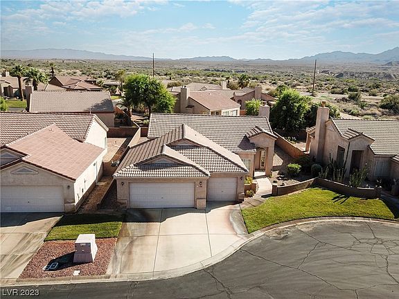 1 story 3 car golf course gated master planned community! Here's your least expensive opportunity to live in the only over 55 community in tax free Laughlin. Located in the Desert Springs master plan community and only moments from the restaurants, gambling and movie theater inside the Avi casino. The Colorado River is less than a mile to the east and continuous mountains in all directions. This Spanish style single story with three car garage, two bed, two bath has a north / south exposure and a large stuccoed patio. No neighbors behind and a short walk to the community pool. Set behind a natural grass front yard the association maintains and tucked behind the wide streets of the community. Tiled throughout all but bedrooms and offering the necessary step in shower next to a garden tub. Private entrance to back yard off master gives additional light and access to back yard.