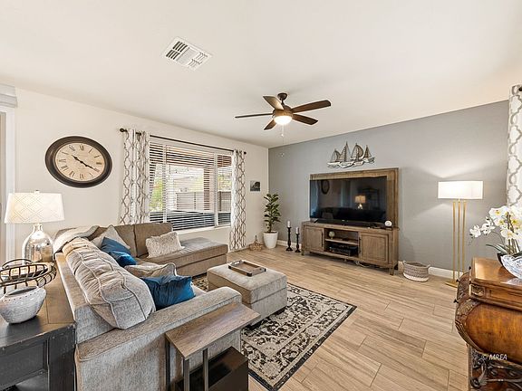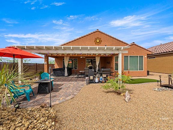 Simply Stunning! Situated on a premium corner homesite, this location is a rare find as it neighbors a large green park which opens up to panoramic views of the Southern Mountains. The front yard offers endless sights of the Flat Top Mesa and evening sunsets are often & absolutely gorgeous. The extended paver patios allow for plenty of outdoor living. Costly pergolas extend the back patio and cover the central courtyard which offers an intimate space for outdoor dining. A beveled glass door invites you in and custom plank tile covers the floors. Tray ceilings, soft arches and 8' openings add sophistication to the space. Upgraded cabinets, granite, farmhouse sink, gas cook top, modern back splash & stainless hood accent the kitchen. A large center island faces the central patio that lets in the gorgeous mountain view & allows for an abundance of natural light in the home. The costly bay window in the owner's suite is appreciated & the ensuite hosts duel vanities & beautiful tile surround shower. Double doors open to a large den/office and the laundry room is amazing... full of cabinets & a utility sink. The extended garage has built-in cabinets, tankless water heater and softener.