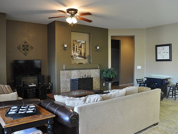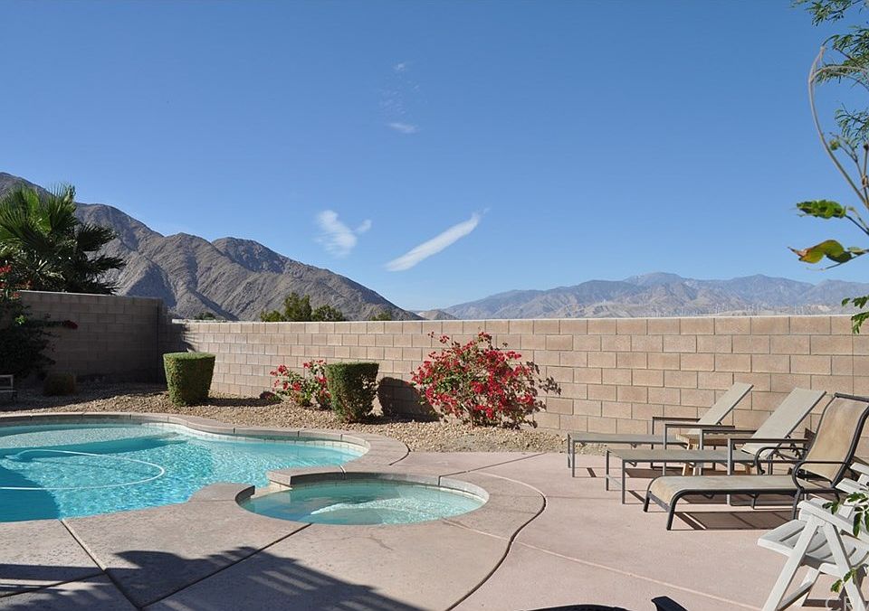 WOW - Cul de sac home with PANORAMIC views!! This lovely 3 bedroom 2 bath home with it's own private pool & spa featuring a baja deck and a removable gate. Situated on a premier lot with no-one behind you which allows for incredible 180 degree mountain views and optimal privacy!!! This home is ready for you to make it your own. Upgraded with large faux stone tile flooring, decorator paint schemes, mirrored wardrobe doors, ceiling fans & smart TV's, patio covers out back and more! Plus a 2 car garage with direct access. Mountain Gate is a gated community with 3 community pools/spas and a private park plus tennis courts too and YES you own the land!