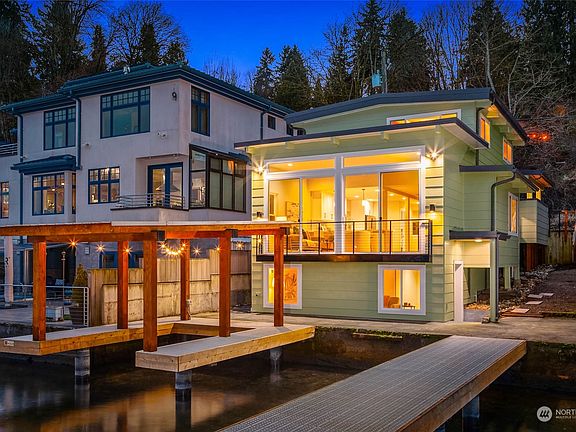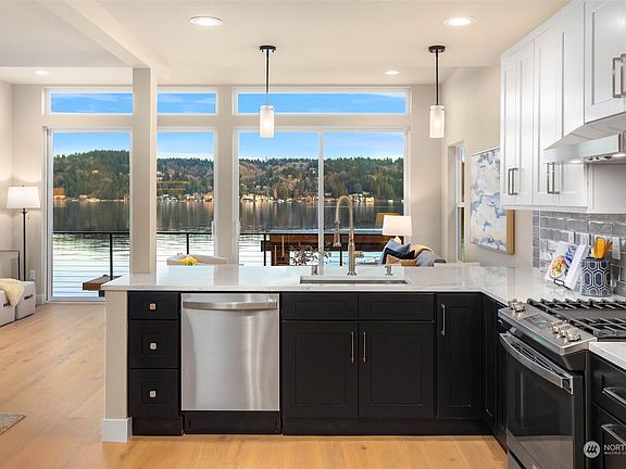 Spectacular waterfront living on Lake Washington featuring panoramic lake and mountain views, a covered horseshoe dock, and 30 ft of private waterfront. Rebuilt down to the studs in 2023 and masterfully crafted with natural oak floors, slab countertops, custom cabinetry, and a stunning chef’s kitchen. Unparalleled views and lakeside living at its finest, with dual glass doors opening to the outdoor balcony. Upstairs boasts tongue and groove ceilings with golden sunrise views in the primary. The fully finished lower level provides direct access to pristine waters all within a protected cove. Located steps away from the iconic Burke-Gilman Trail with easy access to the vibrant city life. Vacant lot next door available for sale, MLS# 2188643.