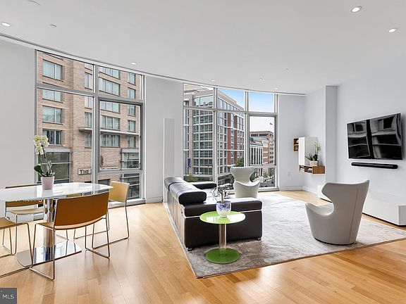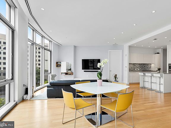 22 WEST - Located on the coveted curve with one of the best floor plans in the building, this 1,571sf two bedroom + DEN, 2 bath offers panoramic views along 22nd St and M St. Unique features include the curving wall of floor-to-ceiling windows across the living room and dining room, a spacious kitchen island, entry foyer with generous closet space and long gallery wall, and one of the largest laundry rooms ever found in a condo. Recent improvements include Lutron remote control motorized shades for all windows, extensive recessed lighting, new light fixtures, and new water source heat pump system. This high end residence offers Poggenpohl cabinetry with under cabinet lighting, Sub Zero and Bosch appliances, granite counters, 9' ceilings and white oak floors. The building offers 24-hr front desk concierge, doormen, rooftop pool, sundeck, party room, grilling area, and fitness room. Condo fee includes all utilities, FIOS internet, and Verizon TV. Two car underground parking and large storage unit are included.