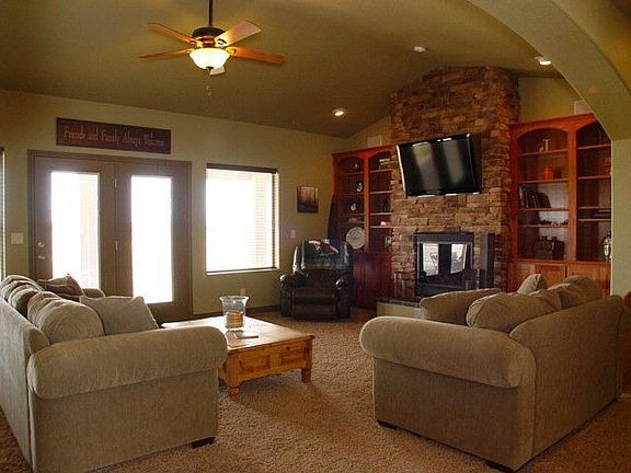 Beautifully Upgraded Custom Ranch Home w/ Mountain Views ~ 2x6 Construction w/ Stucco Exterior ~ Travertine Tile in Entry ~ Spacious Living Room w/ Custom Cherry Cabinetry surrounding Gas Fireplace ~ Gourmet Kitchen w/ Breakfast Nook, Pantry, Granite Countertops, Cherry Cabinets and Jenn-Air Stainless Steel Appliances including Downdraft Gas Cooktop in Center Island, Custom Panel French Door Refrigerator, Convention Oven & Built-in Microwave ~ Slate Tile in Kitchen & Laundry Room ~ Formal Dining Room & Executive Office w/ Acacia Wood Flooring ~ Luxurious Master Suite w/ 11x5 Walk-in Closet, 9x9 Dressing Area, Adjoining 4-Piece Bath w/ 7x4 Walk-in Shower & Access to 48x13 Custom Stamped Concrete Covered Patio ~ Surround Sound Inside & Outside ~ Dog Shower in 3-Car Insulated Attached Garage