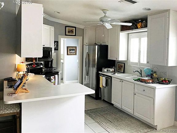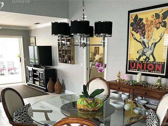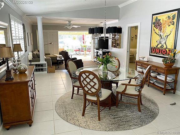 Florida Club 2 BR, 2 BA extended Capri model w/large screened lanai & stunning water views overlooking the 17th green of the golf course. Home has many upgrades incl. crown molding, plantation shutters, all steel appliances, new A/C (2015), wtr htr (2016), elec fireplace, & glass entrypoint door. Entire exterior repainted. All interior repainted (2015). Other features: central vac, hurricane shutters, & extra landscaping. 20X30 lanai is roomy & perfect for outdoor gatherings. The Florida Club is a well maintained, gated community w/pool & tennis/pickleball courts - a 2 min walk from the home. The golf course is one of the best on the Treasure Coast. This home is a commuter or snowbird's dream w/easy access to I-95, restaurants & shopping. Most furnishings are available for sale separately
