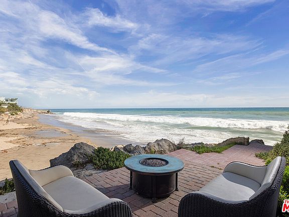 Who wouldn't want to live on the beach? Be the fortunate one to own this fabulous home, perfectly sited offering not only stunning ocean views in front but also unobstructed whitewater coastline views to the side from nearly every room in the house, certainly from every bedroom. Perched on a small promontory that extends beyond the neighboring houses, this turnkey home is a true dream come true. Imagine waking up to the sound of waves and stepping out through a sliding glass door that leads directly onto the beach via a private pathway. This is the closest thing to having your own private beach in California. Inside, the house is equipped with top-of-the-line Viking stainless steel appliances, ensuring your culinary adventures are nothing short of exceptional. The beachfront deck is perfect for enjoying sunsets, while the remodeled bathrooms and built-out closets add a touch of modern elegance. There are exquisite built-ins in the living room and the primary bedroom, adding both style and functionality. The primary bedroom also features a retractable TV within the cabinetry for your viewing pleasure. With stone floors downstairs and wood floors upstairs, the house exudes a seamless blend of sophistication and comfort. The private sandy sitting area beside the house offers a serene spot for relaxation, and the wine cellar is ideal for the connoisseur. The main house features 2 bedrooms and 2 1/2 baths, providing ample space for family and friends. The detached guest house, with 1 bedroom and 1 bath, offers an astounding ocean view that will captivate your guests. The open-air courtyard is your private outdoor oasis, perfect for barbecues or cozying up by a fire pit. Parking is a breeze with a 2-car garage and room for 2 additional cars. Nestled behind gates and close to a famous surf spot, this property is truly one of a kind. Just move right in to experience the best of Malibu living.