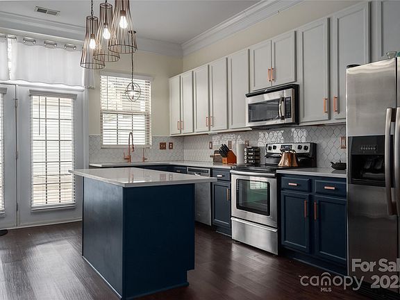 This spacious 3 bedroom 2.5 bath home overlooks hole #4 at Red Bridge Golf Course just 10 miles from I-485 (Albemarle Road). The view of the pond and Red Covered Bridge is amazing and unobstructed. The downstairs open floorpan with 10 ' ceilings includes living area, conversation area, kitchen, dining, and 1/2 bath. New quartz countertops. The 2nd floor includes 2 full baths, primary and guest bedrooms, laundry and again killer views of the golf course and Rock River Vineyard. The 3rd floor large bedroom with barn door custom closet is a sweet oasis of peace and solitude. The rear patio area is a fun space with new poured cement, vinyl fencing, and strung party lights. The single detached garage has nice built-ins for storage. Best of all NO HOA fees.