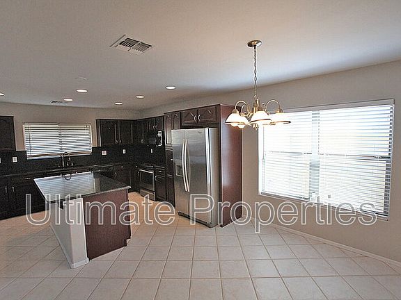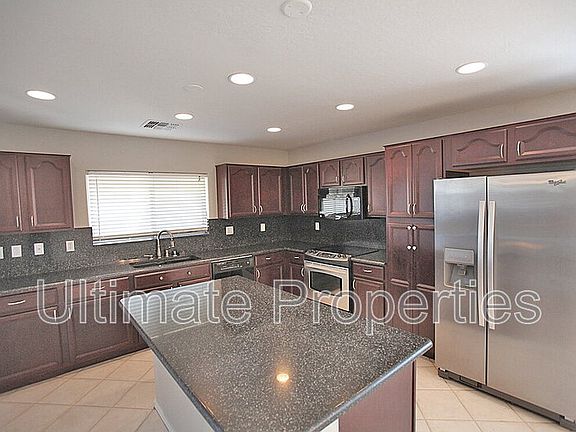 Beautiful 4 Bedroom + 2.5 Bathroom with a Den/Office located downstairs. Kitchen features granite counters, upgraded cabinets, refrigerator, range/oven, dishwasher and built in microwave, and kitchen island. Very open floor plan - kitchen opens to family room. Master suite features walk in closet, separate tub and shower and dual sinks. Backyard features covered patio, grassy area and desert landscaping.