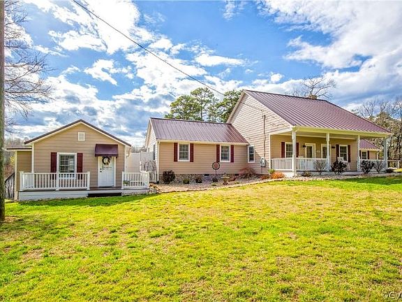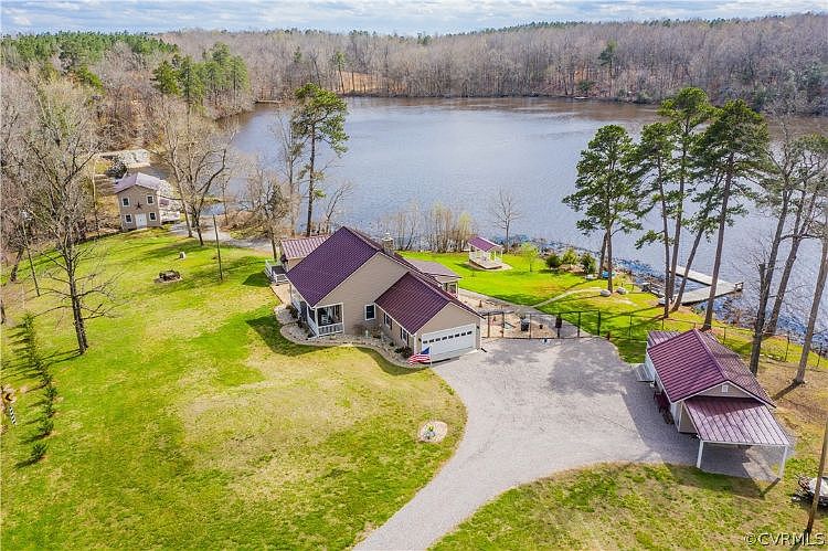 WATERFRONT ON COLEMANS LAKE! This sprawling property offers a mixture of old and new with pieces of history! The main dwelling features gorgeous views of the lake from the kitchen, bedroom, bathrooms and laundry room. Hardwood floors throughout. Family Room w impressive stone fireplace, New Mendota Gas Log Insert, and built-ins, Dining Room, Kitchen w New granite counters and tile backsplash. Laundry Room w tons of cabinets! Full Bath w New tile shower, floors, counter and vessel sink. Half Bath w New vanity, huge Primary Bedroom w walk-in closet. Rear Screened Porch to watch sunsets. Attached 2 car Garage has cabinets and shelving. NEW since mid 2019: All exterior doors, gutters and gutter guards, composite decking, interior and exterior paint, light fixtures, ceiling fans and much more! The semi-attached Cottage serves as guest bedroom office w half bath and original wood floors. The renovated Mill by the dam is a part of Dinwiddie history built in 1896 and offers endless possibilities! Plus there is a Workshop w cabinets, Storage Bay and New Carport. New Gazebo by the lake and a floating teak wood Dock. Access to 120 Acre Hunting Preserve! 60 Acre Private Lake w great fishing! Tons of wildlife!