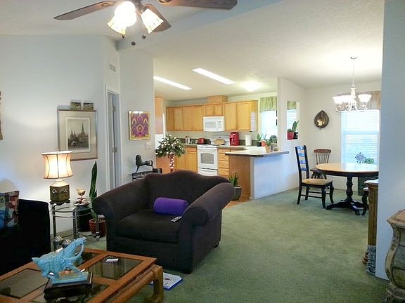 This three bedroom two bathroom home is loaded with upgrades and quality features. The large master bedroom has an additional sitting room which itself is spacious. This home has tape and textured walls throughout, even the bathrooms. It also has vaulted ceilings throughout. The master bathroom has a step in shower, a porcelain sink, and extra oak cabinets. The second bathroom has a one piece tub shower combo, a porcelain sink and a very nice custom shape frosted window to let in lots of natural light. The kitchen is very large and features lots of oak cabinets, plenty of counter space and a huge pantry. This home features a heat pump to efficiently meet your cooling and heating needs. The exterior is beautifully landscaped with mature trees and shrubs all around. There is a sprinkler system, and a large nice tough shed that also has a window. This 2005 Golden West home is loaded with interesting features.