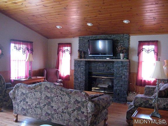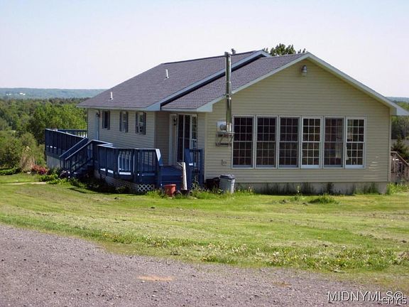 Plenty to offer in ths 3 bed 2 full bath contemporary ranch. Open common area with cathedral ceilings and a private sun room, to watch the sunset! Wrap around deck, more living area in bsm 2 car att. garage, 7 acres with great views, a horse barn and kenel set up with electric, water and septic