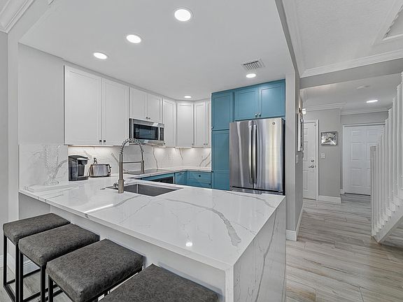Recently Remodeled 2 BR 2.1 BA townhouse in Saint Andrews at the Polo Club. This stunning townhome offers an updated Kitchen with designer cabinets, quartz countertops and top of the line Stainless Steel GE appliances. All three bathrooms have been updated with cabinets and quartz vanity tops . The lower and upper floors have wood like porcelian tile throughout. Both primary and secondary bedrooms have en-suite bathrooms. This townhome will convey furnished (with a few exclusions) and has a second car garage conveniently located to unit. Newer HVAC 2020. The property is situated within minutes to all equestrian venues and across the street from Publix.