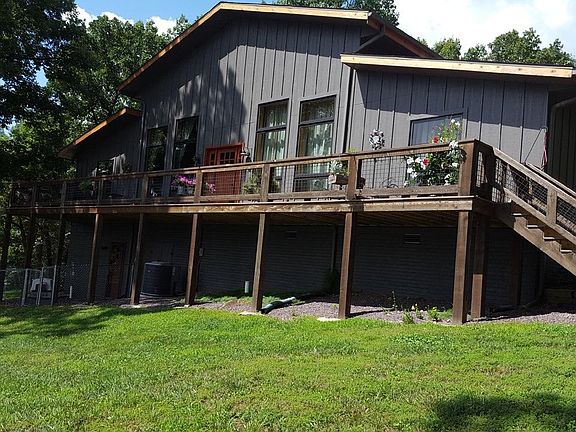 Rustic home with high vaulted ceilings, whole house generator, and loft located in beautiful setting. Interior is Western Cedar Timber frame and exterior is Duralock siding. Breezeway to double garage. Split level heating using electric and gas. Home features hardwood floors, large windows overlooking covered deck and property. The 3rd BR is located in the basement and could easily be used as office or music room. Main floor bedrooms have their own bathrooms. Open floor plan combining kitchen, dining room, and living room. Large covered deck made from Trex material on back of the house. Extras: Metal building with concrete floors 16x24, pigeon and chicken coops 16x24, greenhouse 6x14, landscaping, vineyard, high speed internet (fiber optic)