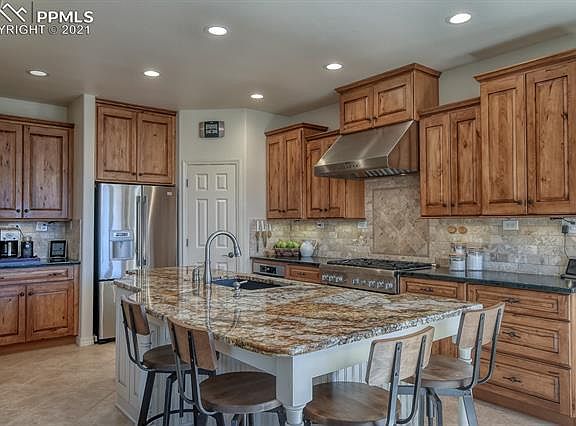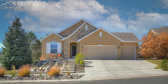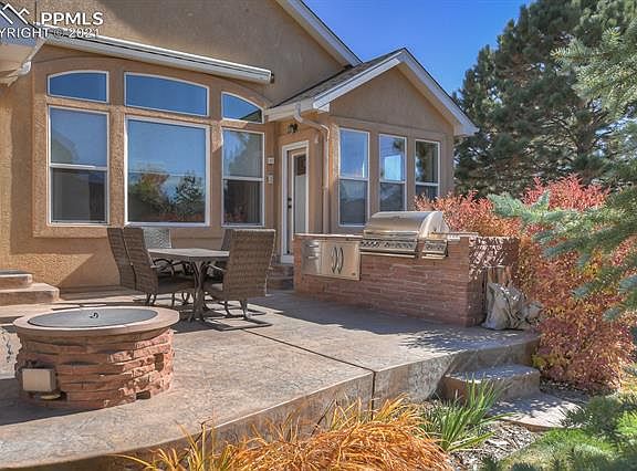 Stunning stucco and stacked stone rancher in the area of Deer Creek At Northgate that features 4 bedrooms, 3 baths, 3 car garage and has 3,673 sq ft. Lovely corner lot with Pikes Peak and Front Range views, professionally landscaped with water feature, stained concrete patio, built-in gas grill and also includes a hot tub. French doors lead to the office with built-in book shelves, desk and cabinets. Open great room with stacked stone fireplace, built-in entertainment center, large picture window for plenty of natural lighting and is open to the gourmet kitchen with beautiful granite countertops, high-end Thermador Dual-Fueled range/oven, a walk-in pantry and a walk-out breakfast nook. The master retreat features a bay window nook, a walk-out to deck and a custom barn door leads you into the 5 piece bath with soaking tub. Completing the main level is a secondary bedroom with wainscoting and crown molding, a full size bath and the laundry room with sink, built-in cabinets and includes a stackable washer/dryer. The lower level has a spacious family room and game room with gas fireplace and a built-in entertainment center, two additional bedrooms share a full bath plus a spacious storage room. Extras include custom window treatments, A/C, mountain views, hot tub and radon system. Just Beautiful!