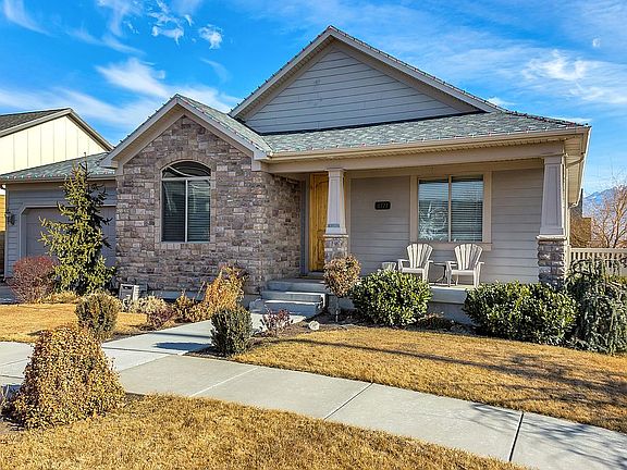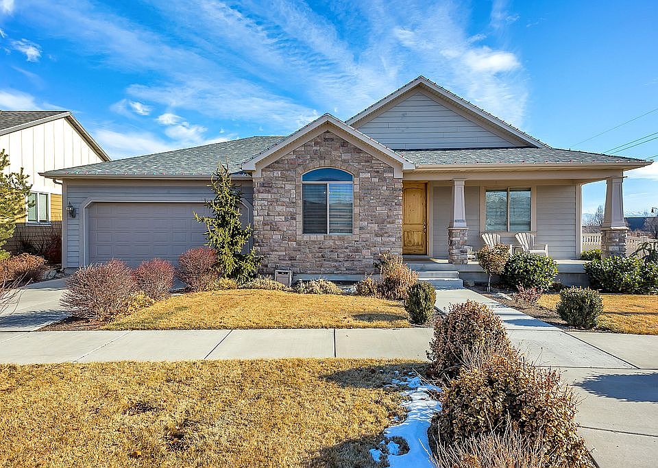 HUGE 4 CAR GARAGE AND SPACIOUS FLOOR PLAN 100% FINISHED! West-facing Daybreak bungalow. Fully landscaped and fenced yard - large for Daybreak community. Features upgraded finishes, open floor plan, vaulted ceilings, 2 gas log fireplaces, hardwood and tile floors, granite counter tops, security system and central vac. Newly finished basement with extra-tall 9-ft ceilings and 3 spacious bedrooms. Basement bathroom has separate shower, 6-ft soaker tub and double sink marble vanity. Great location within walking distance to parks, schools, the lake, shopping and eateries. Daybreak community offers multiple pools, a lake with access to kayaks, paddle boards, row boats, canoes and more! Schedule a showing today! Square footage figures are provided by seller as a courtesy estimate only, buyer to verify.