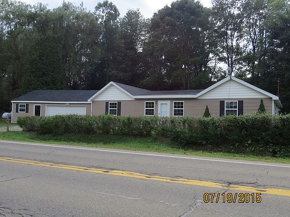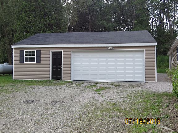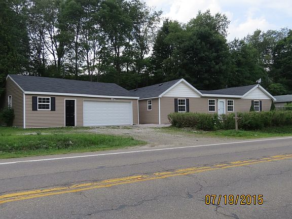 Roomy updated ranch style home with oversize detached garage. New Kitchen, Bath, Windows, Siding, Cement, Heater, H/W, Water tank. Large living room with entrance foyer, family room, and 1 full baths. Lot it triangular shaped.