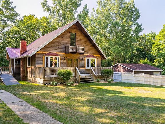 This home is nestled on the top of a hill and surrounded by wildlife and woods. 950 ft road frontage is lined with mature oak trees. Back of the lot is in walking distance to the Maple River. Land to the south east behind the house, along the river, all the way to the rail to trail is DNR protected. The home is a Chalet design with master suite upstairs and full bathroom. Home has a wood burner with a convenient ramp to the home to transfer wood. Basement features an egress window making it easy to finish and to add an additional bedroom and bathroom. Home still needs some finishing touches. Exterior features include wrap around deck, large 2+ stall garage and pole barn. Pole barn has workshop, full mechanics pit and the floors are run for heat. Upgrades include new metal roof, Low E Swing, Slide windows and Wolverine Water Purification System.