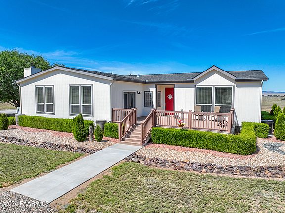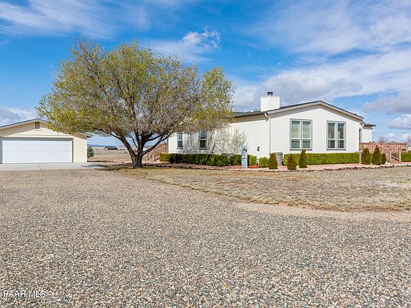 Enjoy the peace and space of nearly 10 acres in Coyote Springs, just minutes from Prescott Valley's schools, medical facilities, and shopping. This well-maintained home features stunning 360-degree views of the Mingus and Granite Mountains. With no HOA restrictions, you can bring your horses, chickens, and cows, and take advantage of raised, fenced planter beds and a 2300-gallon rainwater harvesting system. The property also includes a 16x20 insulated workshop with 110/220 outlets, a large detached 2-car garage. Inside the main home, the spacious kitchen features elegant knotty alder cabinets and a functional layout perfect for cooking