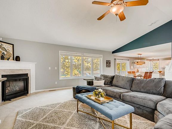 Walk into this beautiful home with high vaulted ceilings in the living room and an updated kitchen with modern and chic lighting throughout. The entire interior has been painted and white paint on the wood work updated to the kitchen cabinets, trim, doors, and windows. Ceilings updated to knockdown with new hard wood floors installed in kitchen, dining, hallway, and entry. New stainless steel stove, fridge, dishwasher, washer and dryer. Upper level has three bedrooms, including master bedroom with private master full bath. Lower level bedroom and bathroom with walkout to beautiful patio. Recessed lighting and slate stone gas burning fireplace fill the lower level family room with a great place to host family and friends. Oversized deck on the main level with stair access to the backyard. A large fire pit area which is perfect for making s'mores and enjoying Minnesota summer nights! Lot behind backyard cannot be built on, so enjoy the nature filled lot with wildlife.
