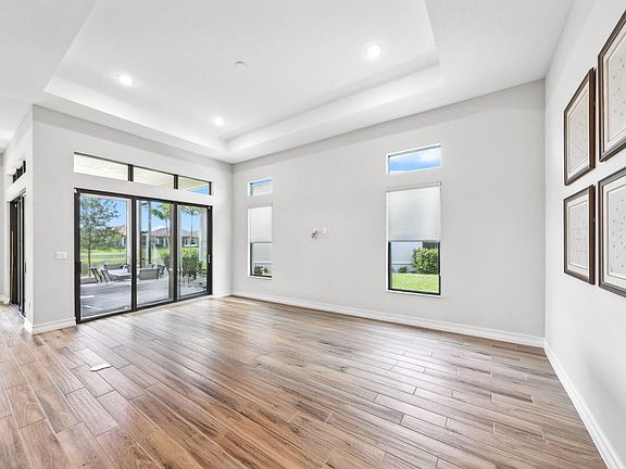 Welcome to your dream home in Four Seasons Parkland. This elegant waterfront property offers a serene escape with stunning views. This Cerelia model residence features porcelain plank flooring throughout, enhancing its neutral interiors. With 2 bedrooms, 2.5 baths, a den, and a bonus room, there's ample space for relaxation and entertainment.The highly upgraded chef's kitchen is a culinary delight, boasting quartz countertops, double ovens, a farmhouse sink and stunning cabinetry. Trey ceilings add a touch of sophistication, while custom closets and window treatments provide convenience and style. Enjoy peaceful mornings or evenings in the screened-in lanai, perfect for taking in the tranquil water views. This home is a true gem, offering luxury and comfort in a picturesque setting.