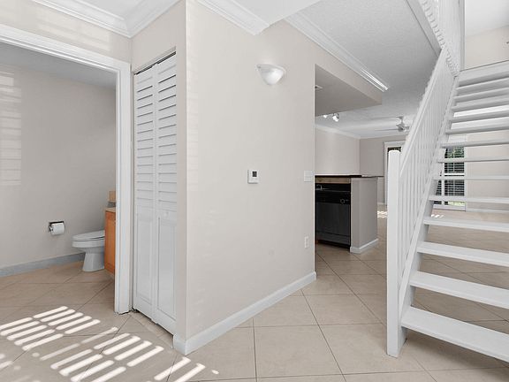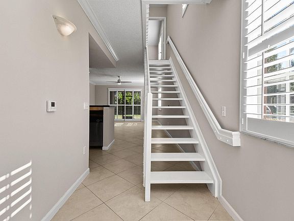 RARE END UNIT TOWNHOME with south-facing windows for lots of natural light. No neighbors above or below. Upgraded kitchen and baths. No carpet - ceramic tile throughout. Plantation shutters throughout. Powder room on the lower level. Screened patio on the lower level. Two suites on the second level each with private full bath and large closets - one has a private patio. Laundry closet upstairs in the hallway between the bedrooms. New central AC (September 2024). Attached one-car garage (only the townhomes have attached garages) with a driveway for a second vehicle. The interior has been freshly painted in a neutral light gray color. New ceiling fans. This is the closest townhome to the pool, gym and other amenities.