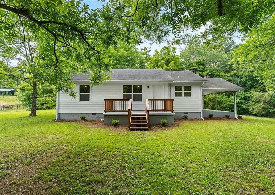 Beautiful traditional home built in 1957 completely renovated in 2018. Dining room/kitchen combo with laundry room off kitchen large enough for pantry shelving. Kitchen has wooden cabinets and Formica countertops. New kitchen faucet, door hardware, toilets and brand-new carpet and waterproof luxury vinyl plank (LVP) flooring throughout. Home is nestled on 1.52 acres of private property with mature walnut and pecan trees, partially wooded providing shade to home and property. House sits back off road with a beautiful view of grassy rolling lawn. Concrete car porch accommodates one car, extra parking in driveway and parking pad. Additional concrete porch on side of home for relaxing. Three entrances to home, into laundry room, kitchen and from the side of home via concrete porch off the master. Three bedrooms, two baths, storage closets, ceiling fans, central heat/air, shingle roof, crawl space, private septic tank. Located near schools, shopping and Mall of Georgia. A must see for investors and first-time home buyers.