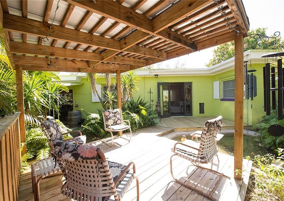 Adorable! Private oasis! Cute as can be! Updated 2 BR/2 BA solid CBS home with office/den or possible 3 BR, large carport, screen enclosed front porch, covered back patio, deck, shed and fenced yard on over 1/3 of an acre located close to Historic Downtown Stuart and Downtown Jensen Beach. Now is your chance to have your very own private oasis in town. Double lot with lush mature landscape including oak, bamboo, fruit trees, sea grapes, palms and a trickling pond make a very calm, peaceful setting. Must-see! Easy to show.