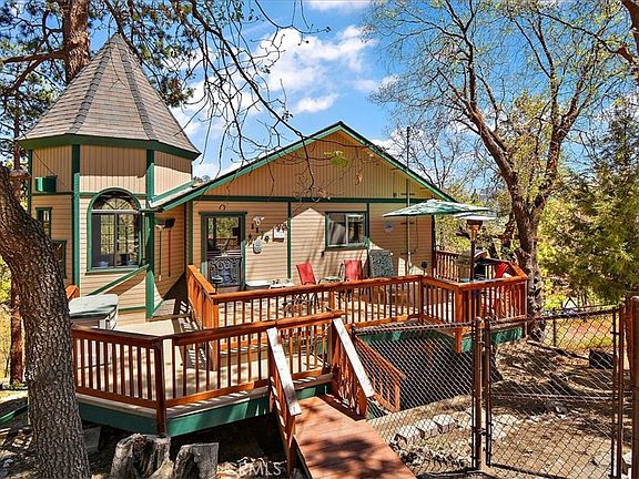 VIEWS, VIEWS, VIEWS!!! This Fawnskin getaway has that cozy treehouse feel with the SPECTACULAR views of the lake and mountains you've been looking for! Relax on your spacious deck and soak in the panorama of national forest, Big Bear Lake, the San Gorgonio mountain range, Snow Summit, and even the JULY 4th FIREWORKS! Or unwind in the great room with its ledger stone fireplace, vaulted ceilings with woodsy T&G finish, and new Pergo hardwood flooring. Opening to the living room, the beautifully remodeled kitchen includes upgraded Frigidaire slate stainless appliances and quartzite countertops. You'll love the primary bedroom which opens to a comfy sunroom for warming to the morning sun. Don't miss the versatile BONUS ROOM that could be a 3rd bedroom, office, hobby room, etc! Complete with newly installed solar panels & generator (wired for battery backup), a carport with a level 2 EV charger, under house workshop, fenced play area for kids and pets alike, & much more! TRULY A MUST SEE!!!