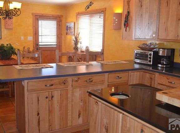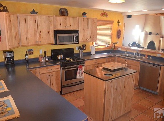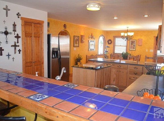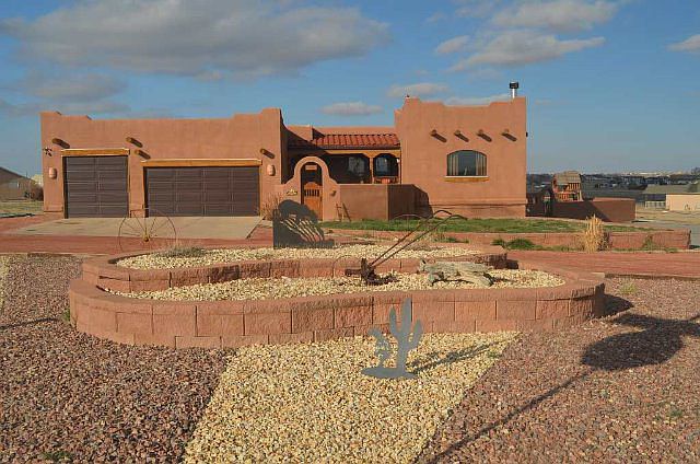 Custom SW Style Home on 1.18 acres only 5 minutes from the North Marina. From the moment you step through the front courtyard to the enclosed stucco fence in rear you enjoy Custom finishes. Open floor plan features open-beam ceilings in living room with kiva style fireplace. Combination Gourmet Kitchen/Dining Room with Island and pantry, two breakfast bars. Living room features latilla ceiling and wood floors. Dining room, entry and hallways have terrazzo flooring. Main level master bedroom/master bath with large walk-in shower, double sink and jetted tub. Antique Claw-foot tub in hall bath. Lower level has 2 add'l bedrooms, full bath and large walkout family room with wet bar and pellet stove. Wraparound Trex deck, sheltered stucco wall enclosure provides outdoor living at its best.