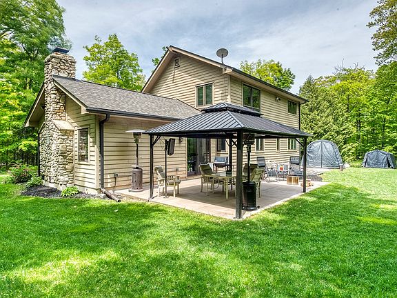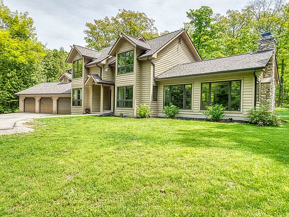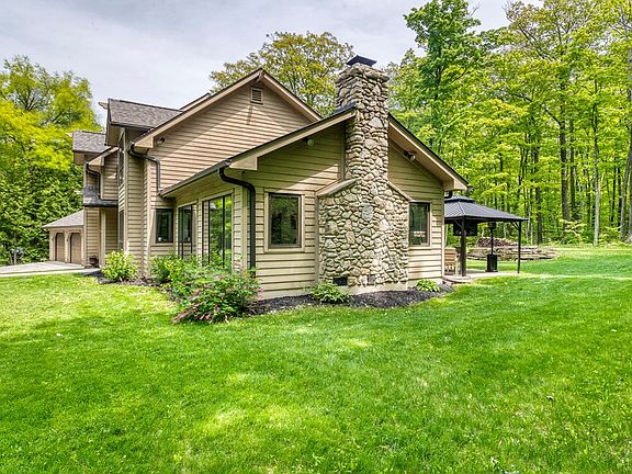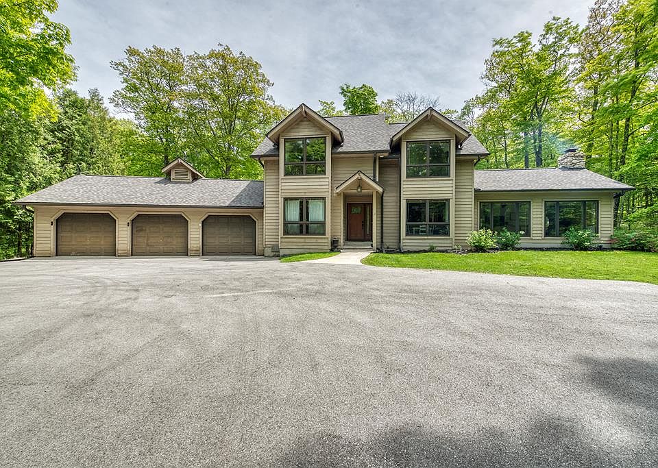 Comfortable year-round home just a short walk to Porcupine Bay public waters. Vaulted ceilings and wood burning fireplace with a Fieldstone surround in the living room. Open concept living, kitchen, and dining are great for large family or entertaining guest. Lovely wooded surrounding offers privacy while you enjoy the back yard patio. New roof in October of 2022 and attached 3-car garage completes this offering.