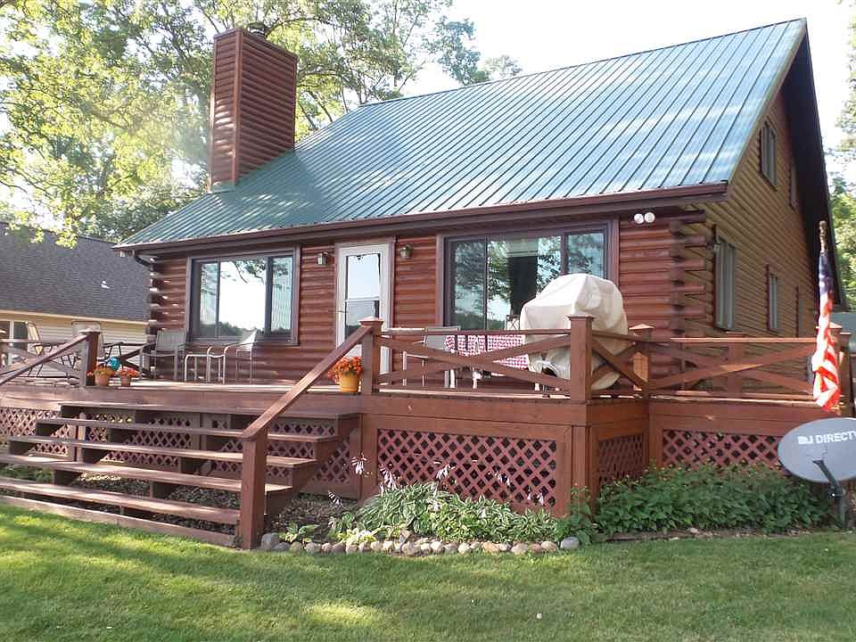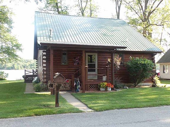 Rustic lakefront property with inviting views of a private wooded Nature Preserve located on 4 lots. This log home features 3 bedrooms, 2 baths, stone fireplace, open concept floor plan with beamed cathedral ceiling & ceiling fans throughout. Main level Master bedroom with walk-in closet and adjoining bath. Updates include: Metal roof, gutters with gutter guards and back porch overhang. Recently added air conditioning, water conditioner, flooring along with two front Picture Windows for that maintenance free lifestyle. Gas hot water furnace has been updated & serviced. There is a heated 3-1/2 car garage with an insulated & floored attic with wood burner and new gas furnace ready for hook-up. Abundant parking on the paved Parking Pad. Large deck with view of woods. Sandy beach for play or swimming on the All Sports lake. Great fishing on this or the adjoining lake. All appliances are included and furnishings are negotiable.