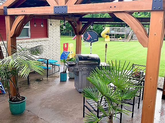 Mid-century home with a master suite with a 3/4 bath, one spacious 2nd bedroom and a 3rd bedroom. It also has a dining room, double entry kitchen, large living area with vaulted ceilings, den with fireplace, large laundry room, full bath, and a half bath. There is also a 2 car attached garage as well as a detached 2 car garage. An added feature is the storm shelter in the backyard.